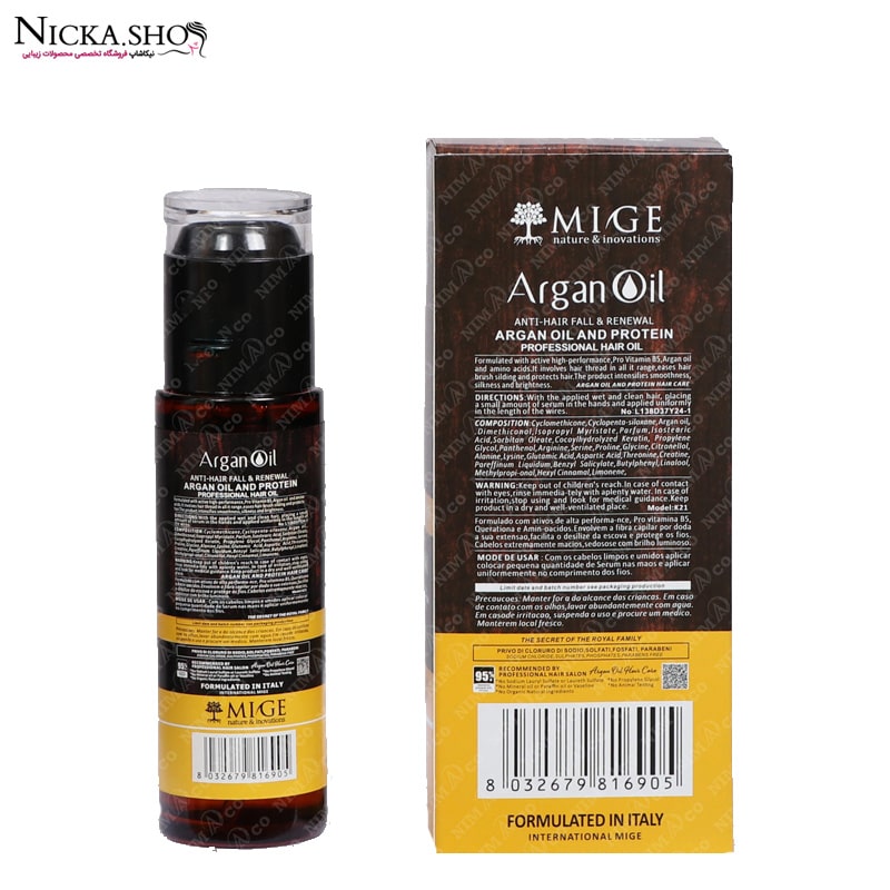 روغن آرگان میگ اورجینال MIGE ARGAN OIL 99 % MIGE تولید شده در یک شرکت معتبر ایتالیایی می باشد که تمام کالاهای مرغوب را بالاترین کیفیت وارد بازار کرده است .