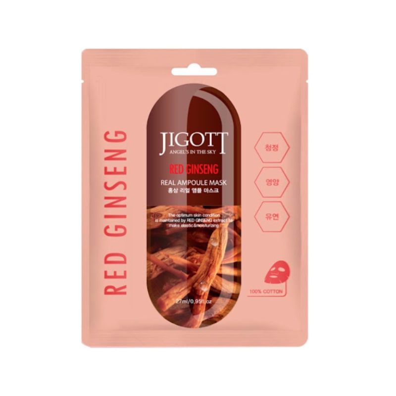 ماسک ورقه ای آمپولی جنسینگ قرمز جیگوت حاوی عصاره جنسینگ قرمز و ریشه زنجبیل هستش که این عصاره ها در جوانسازی و کاهش چین و چروک پوست عملکردی قوی دارن.