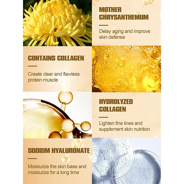 کلاژن موجود در ماسک به افزایش تولید کلاژن طبیعی پوست کمک میکند، که نتیجه آن کاهش چین و چروک و خطوط ریز و بهبود استحکام و انعطافپذیری پوست است.