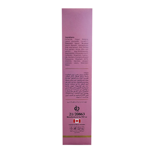 ترکیبات کو کامیدو پروپیل ،بتایین لوریل گلیکوزید لورت ۷ پروپیلن گلیکول بوتیلن گلیکول گلیسریل عصاره هیدرو گلیکولی آلوئه ورا عصاره هیدرو گلیکولی میوه ویتیس وینیفرا عصاره هیدرو گلیکولی ریشه توت سفید پلی اتیلن گلیکول ۱۵۰ دی استئارات نیاسین آمید پلی کواترنیوم کربومر، پتاسیم هیدروکسید آلانتوئین، اسانس مجاز آرایشی و بهداشتی دی سدیم ادت ا دی ام دی ام هیدانتوئین منتول رنگ های مجاز آرایشی و بهداشتی سفید (۷۷۸۹۱، سیاه ۵۷۷۴۹۹ قرمز ۱۷۷۴۹۱ تیتانیوم دی اکسید و آیرون دی اکسید آب دیونیزه.